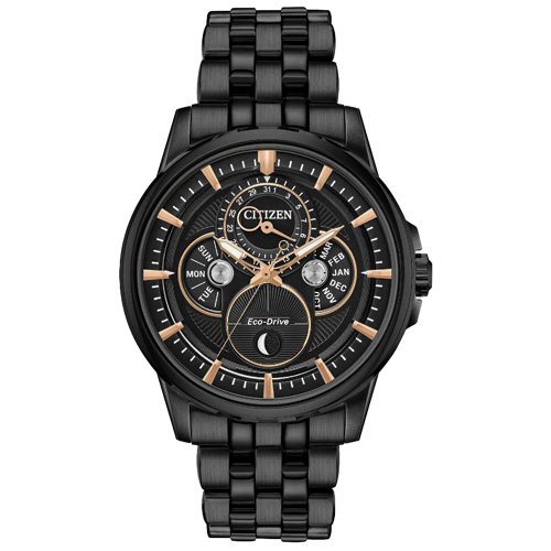 Bring sophistication to your day with the new CITIZEN Calendrier Moonphase, powered by any light with Eco-Drive. This timeless watch features analog month/day/date. Men’s watch featured with black ion plated stainless steel case and bracelet with black dial. Featuring our Eco-Drive technology – powered by light, any light. Never needs a battery
