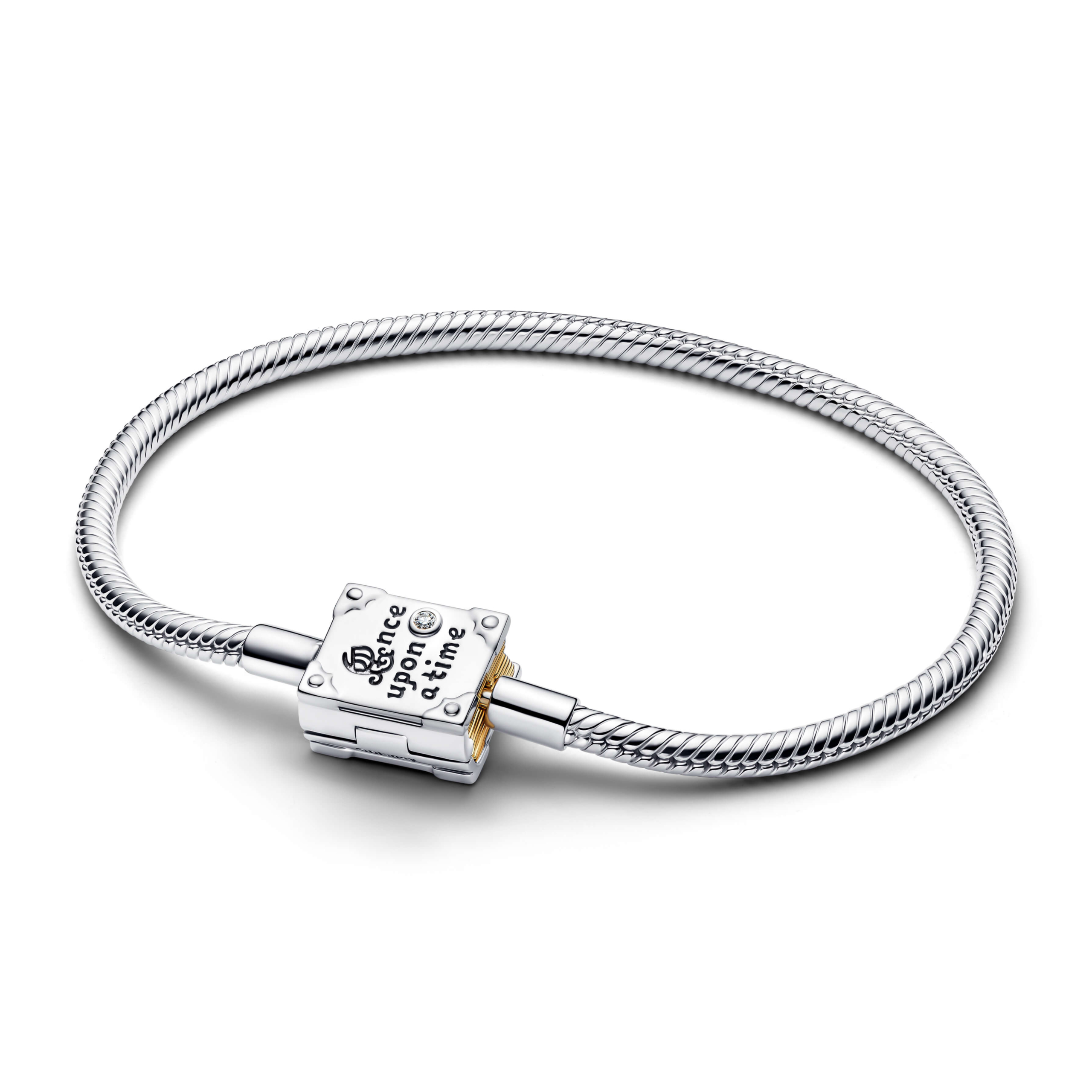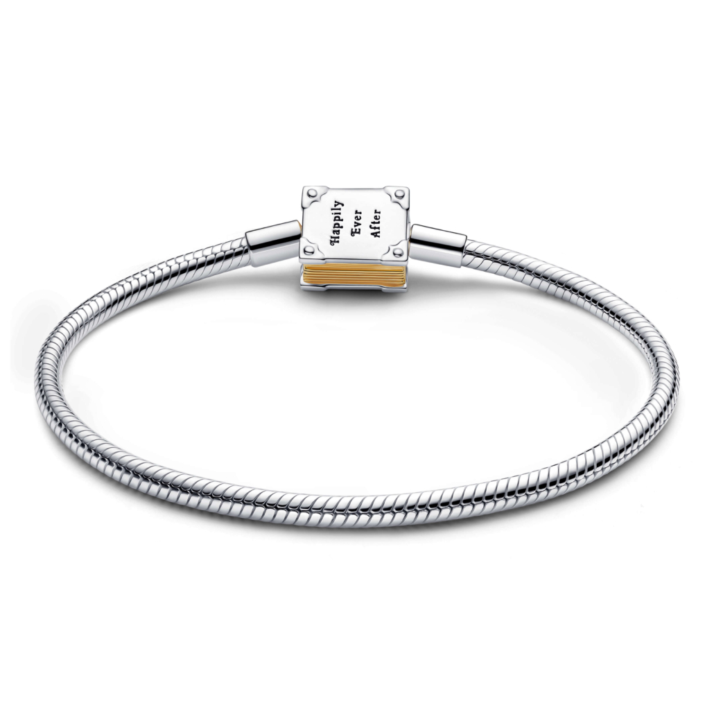 In sterling silver, this Disney x Pandora snake chain bracelet secures with a book clasp. Detailed with engravings on both sides, a lab-grown diamond and 14k-gold plated pages, it magically styles your next chapter.