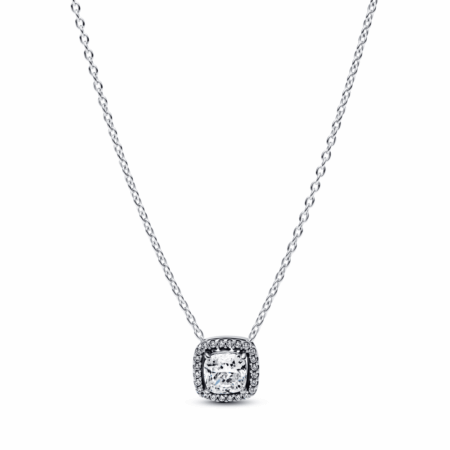 Elegance never goes out of style. Featuring a square center stone surrounded by a sparkling halo, this sterling silver necklace will remain a staple in your stack.