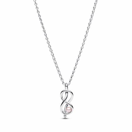 Bring a pop of pink to your neckline with the Infinity Knot Collier Necklace. This sterling silver necklace features a pink lacquered artificial pearl nestled inside an infinity knot symbol, which is set with sparkling stones at each end. Slide the pendant on the chain to adjust the length. Elegant yet irreverent, the pink pearl adds just enough colour to liven up any look ? but can also function as a versatile neutral.