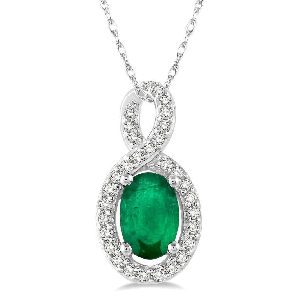Express your affection with this stylish emerald and diamond pendant. Fashioned in 10 karat white gold, this pendant features an eye-catching prong set oval cut emerald center stone wrapped in a circular frame set with 31 prong set round cut diamonds along with the front edge in ribbon design. This pendant hangs from a rope chain. Total diamond weight is 1/10 ctw and emerald measures 6×4 mm.