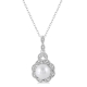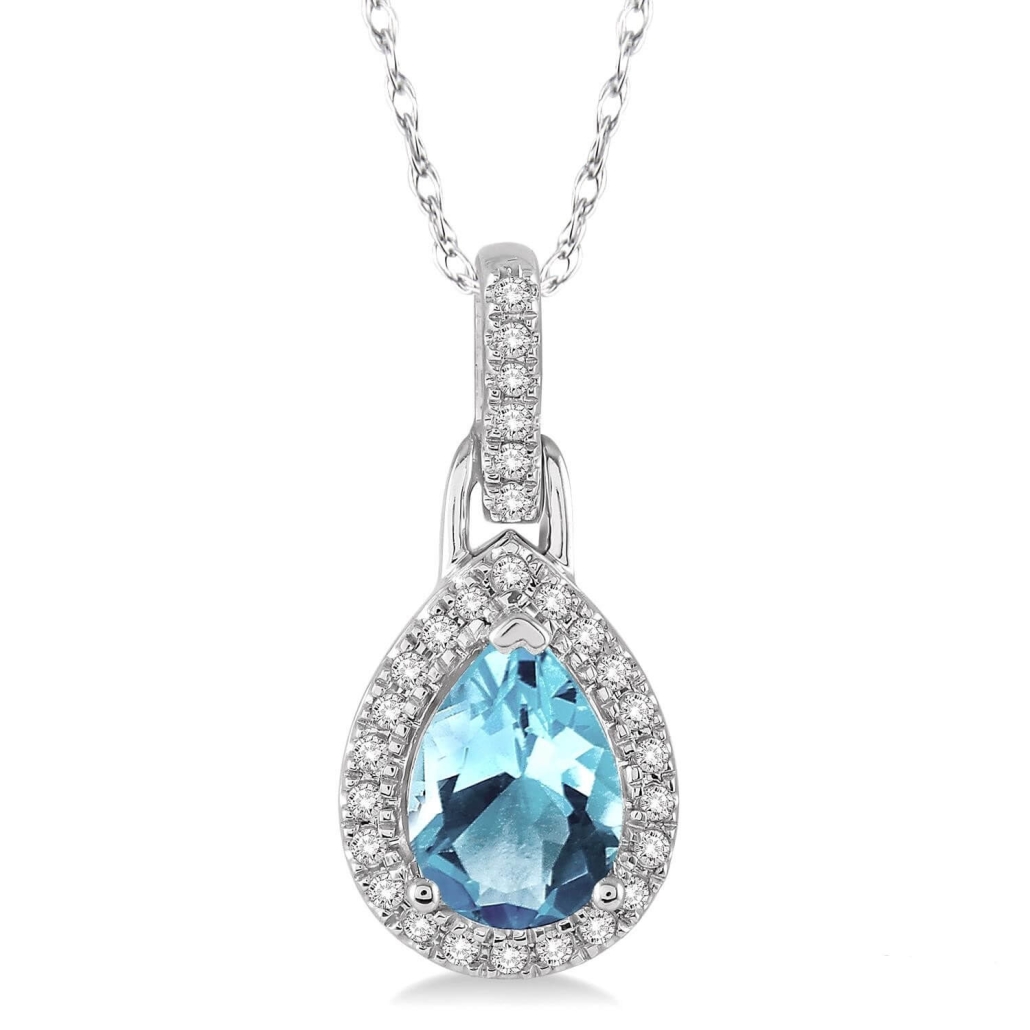 Entice her with the lovely look of this ravishing aquamarine and diamond pendant. Styled in glinting 10 karat white gold this pendant features a marvelous pear shape aquamarine nestled among the sparkling 28 pave set round cut accents diamonds that creates a halo along with the front edge. This pendant dangles from a rope chain. Total diamond weight is 1/10 ctw and aquamarine measures 7×5 mm.