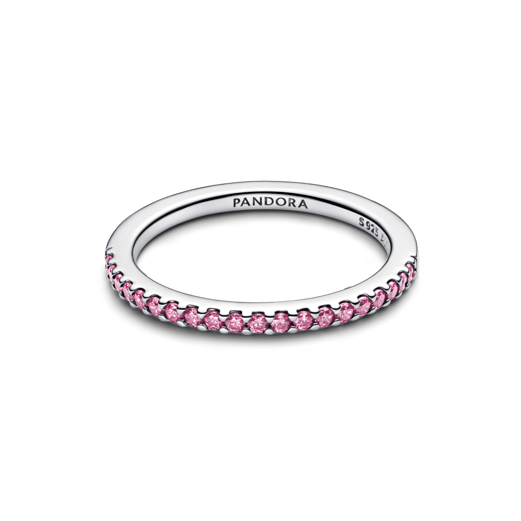 Endless shine for your endless love. This sterling silver band is set with pink cubic zirconia all the way around, symbolising connection that never ends and brilliance from every angle.