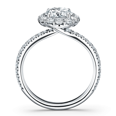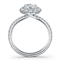 The Vela Halo Engagement Ring embraces gentle curves using a French cut Pavé setting style around the halo and down the band. The accent diamonds are set slightly on an angle, making your Hearts On Fire center appear bigger, brighter, and bolder.